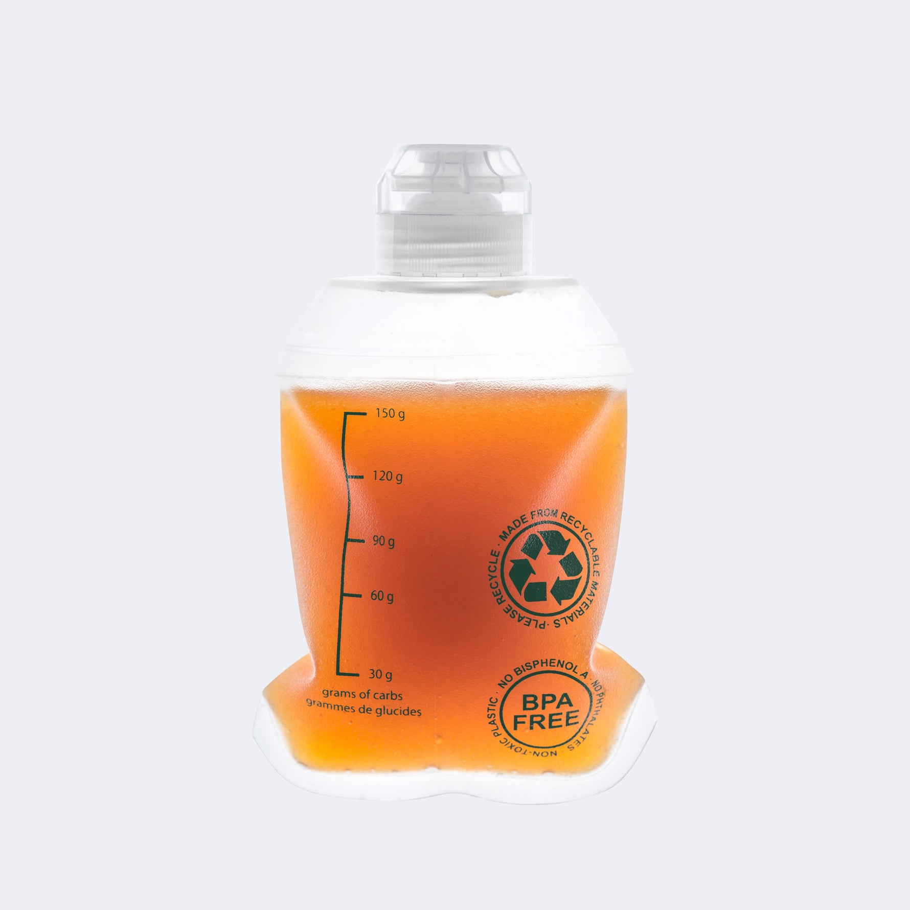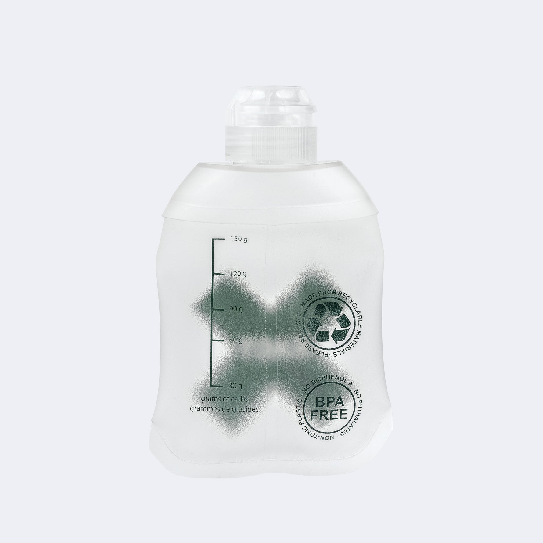 The XACT Soft Flask holds exactly 150g of carbs from our Bulk Gel Pouch, marked with a carb scale so you know exactly how much you're packing. 30g, 60g, 90g, 120g, 150g. Fill to your target. Go.