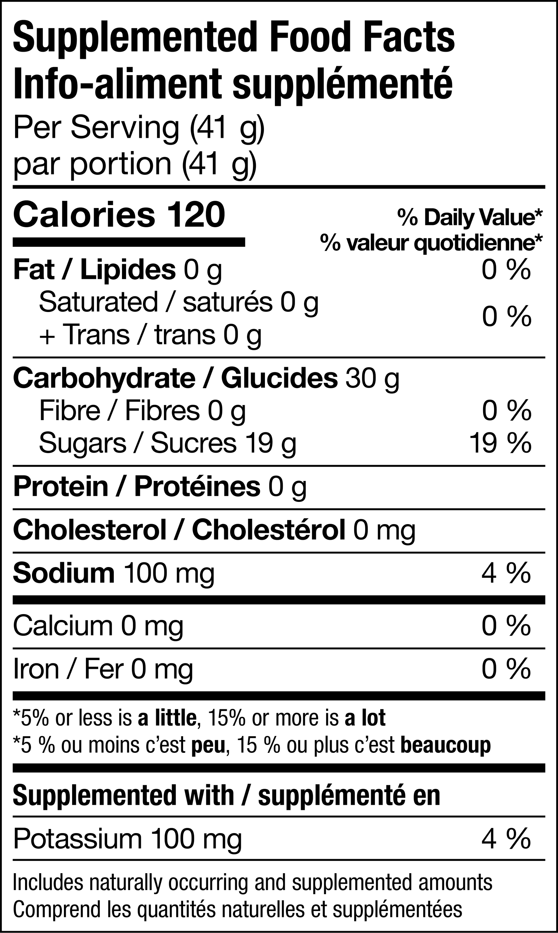 Sucres (sirop de glucose, sucre, purée d'abricots sucrée [purée d'abricots, sucre], purée de pommes non sucrée, fructose), sel, chlorure de potassium.