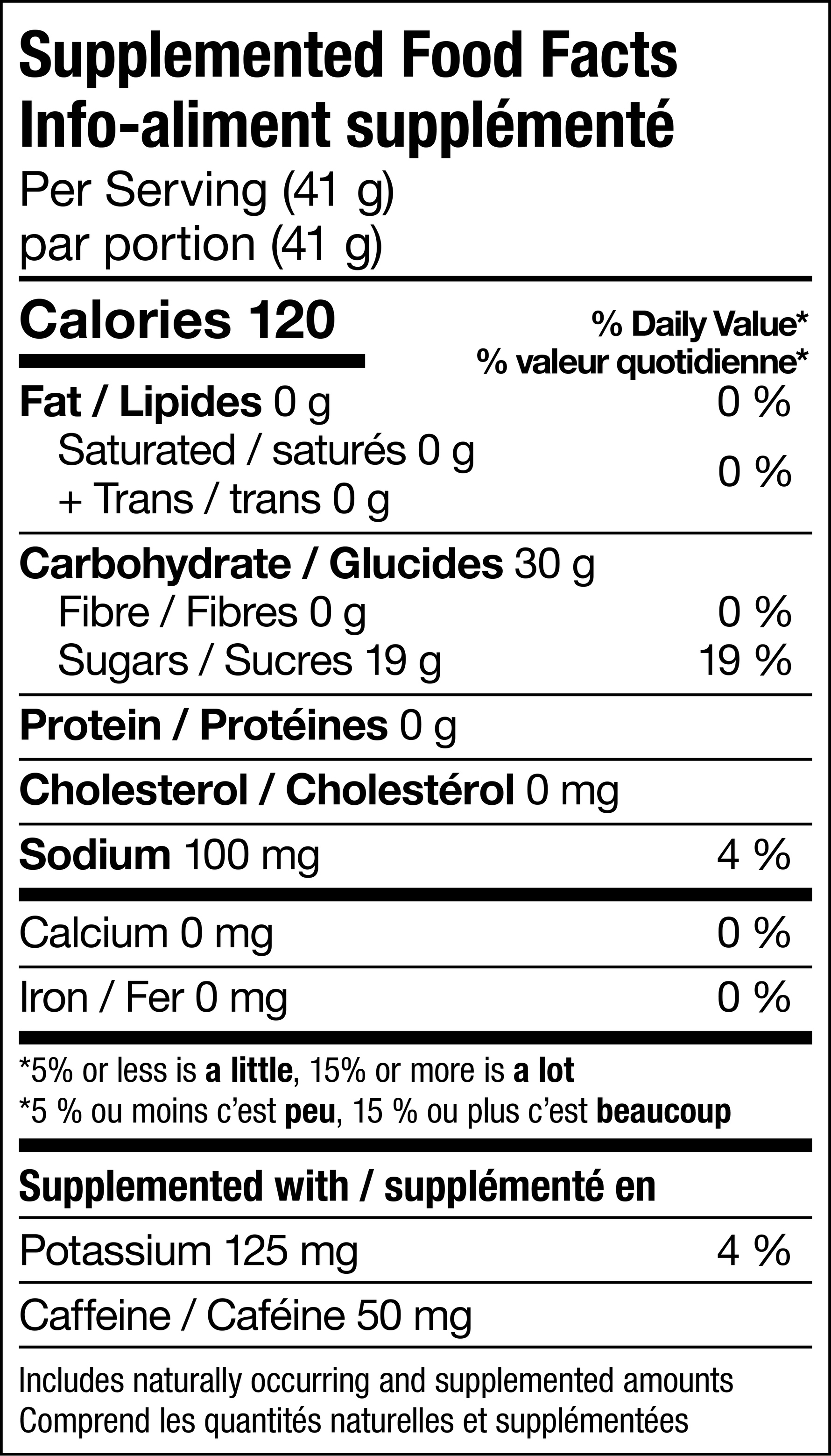 Sucres (sirop de glucose, sucre, purée de pommes non sucrée, fructose, purée de cassis sucrée [purée de cassis, sucre]), extrait de grains de café (caféine), sel, chlorure de potassium.