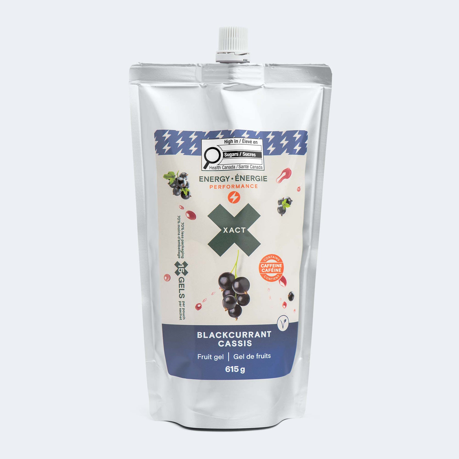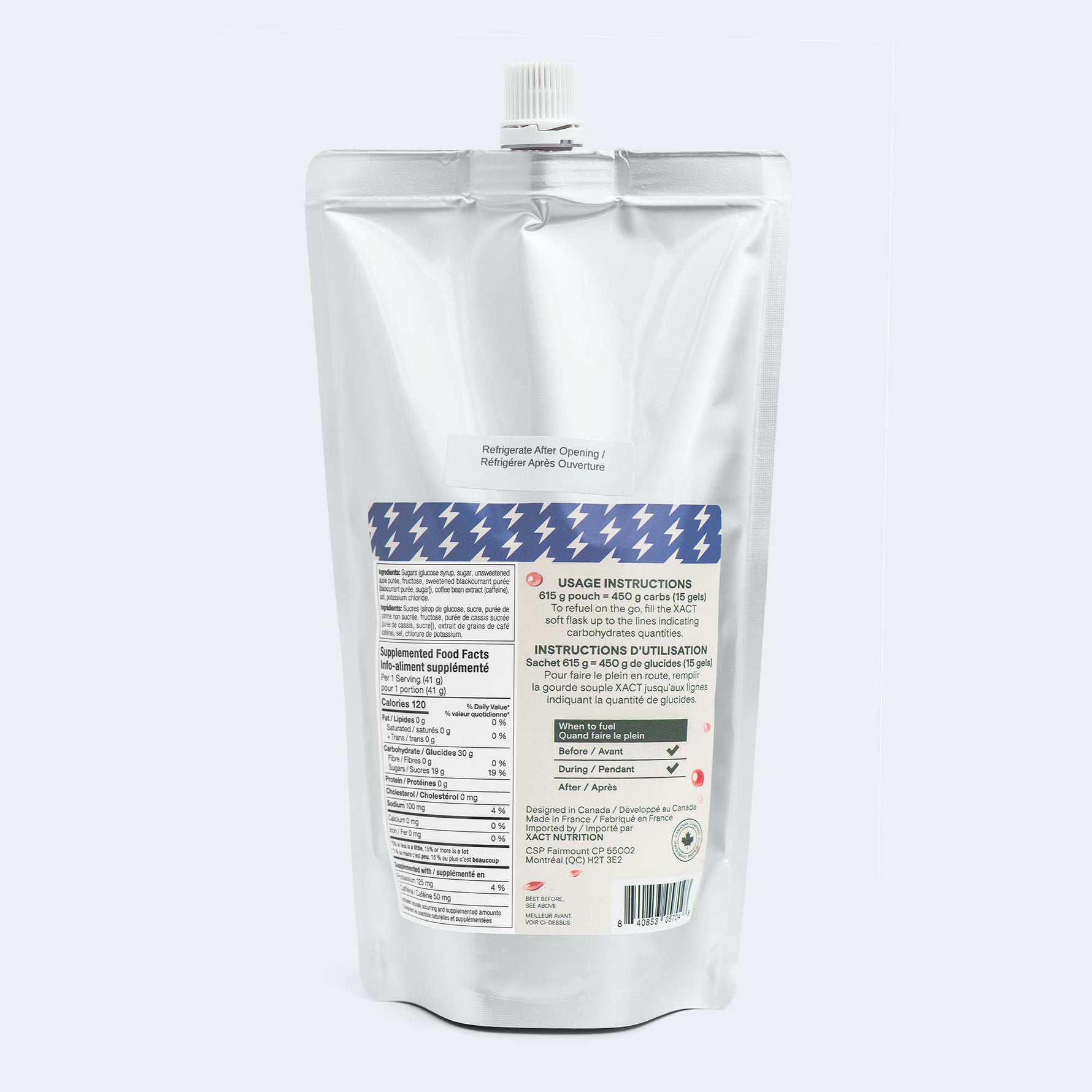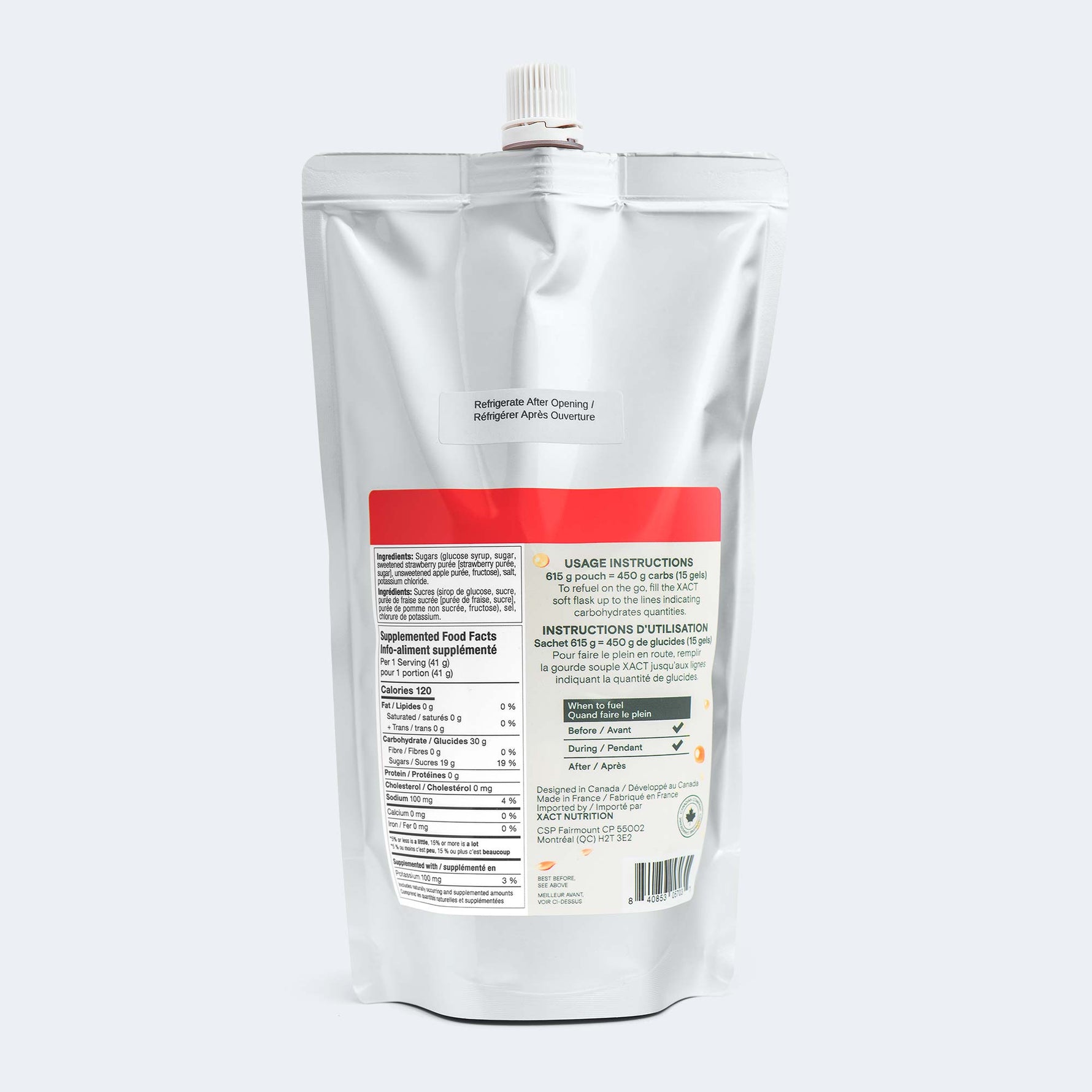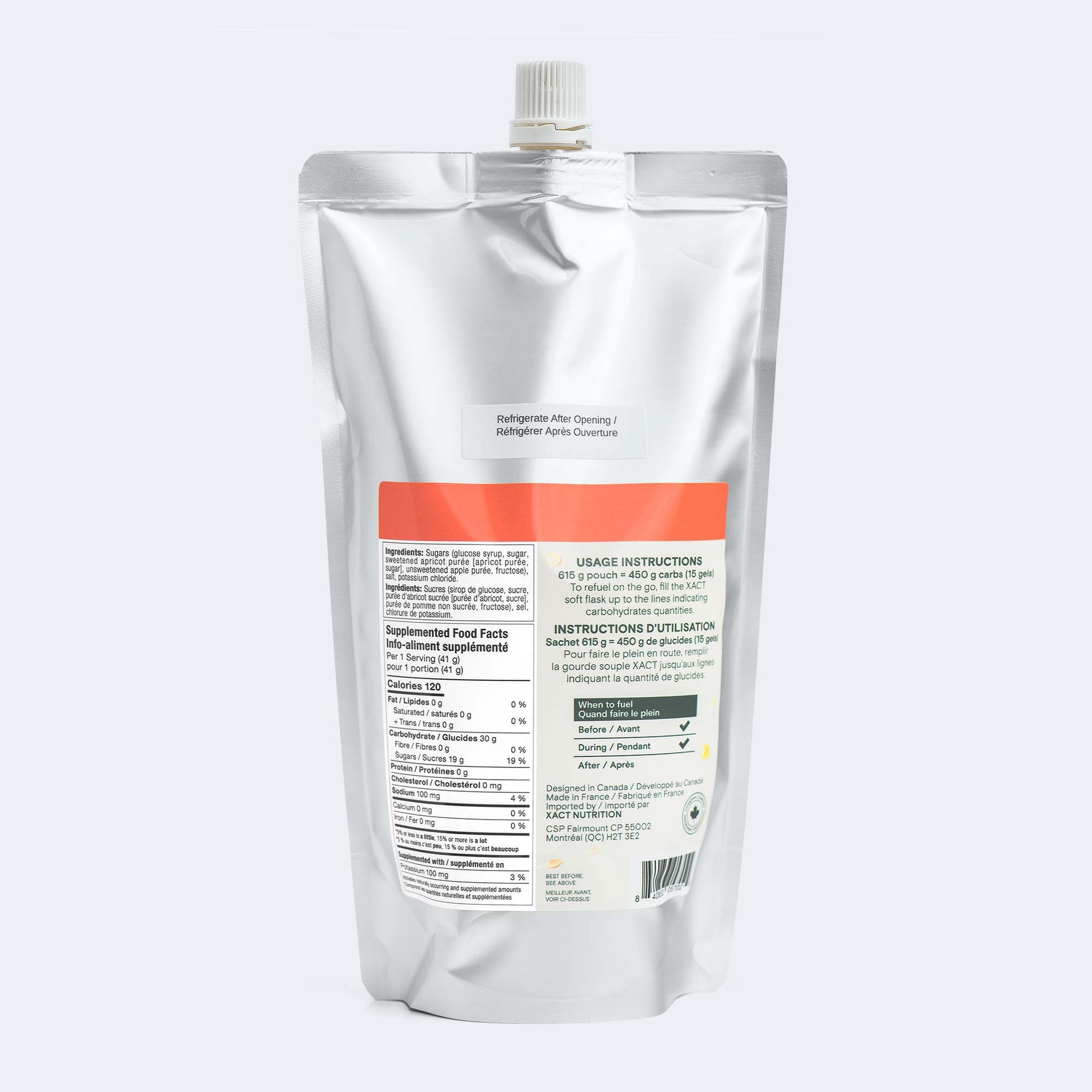 Mêmes 30 g de glucides par portion provenant de purée de fruits frais. Même texture lisse et légère. Même facilité d'utilisation sans mastication. Mais maintenant dans un format où une flasque souple XACT peut contenir 150 g de glucides (5 portions). Jumelez deux flasques et vous transportez 300 g. Trois flasques ? 450 g de glucides. C'est assez de carburant pour vous emmener très loin de chez vous.