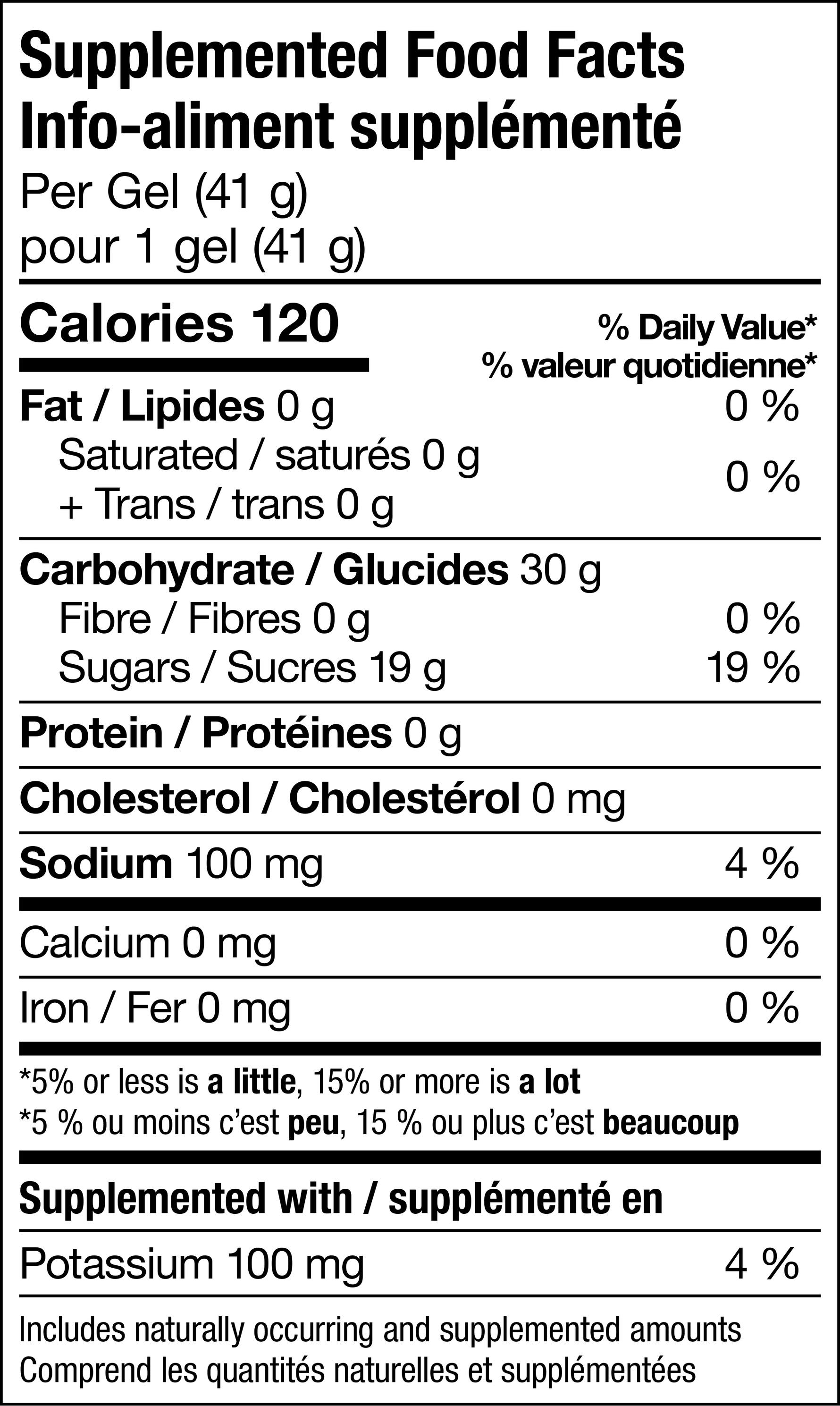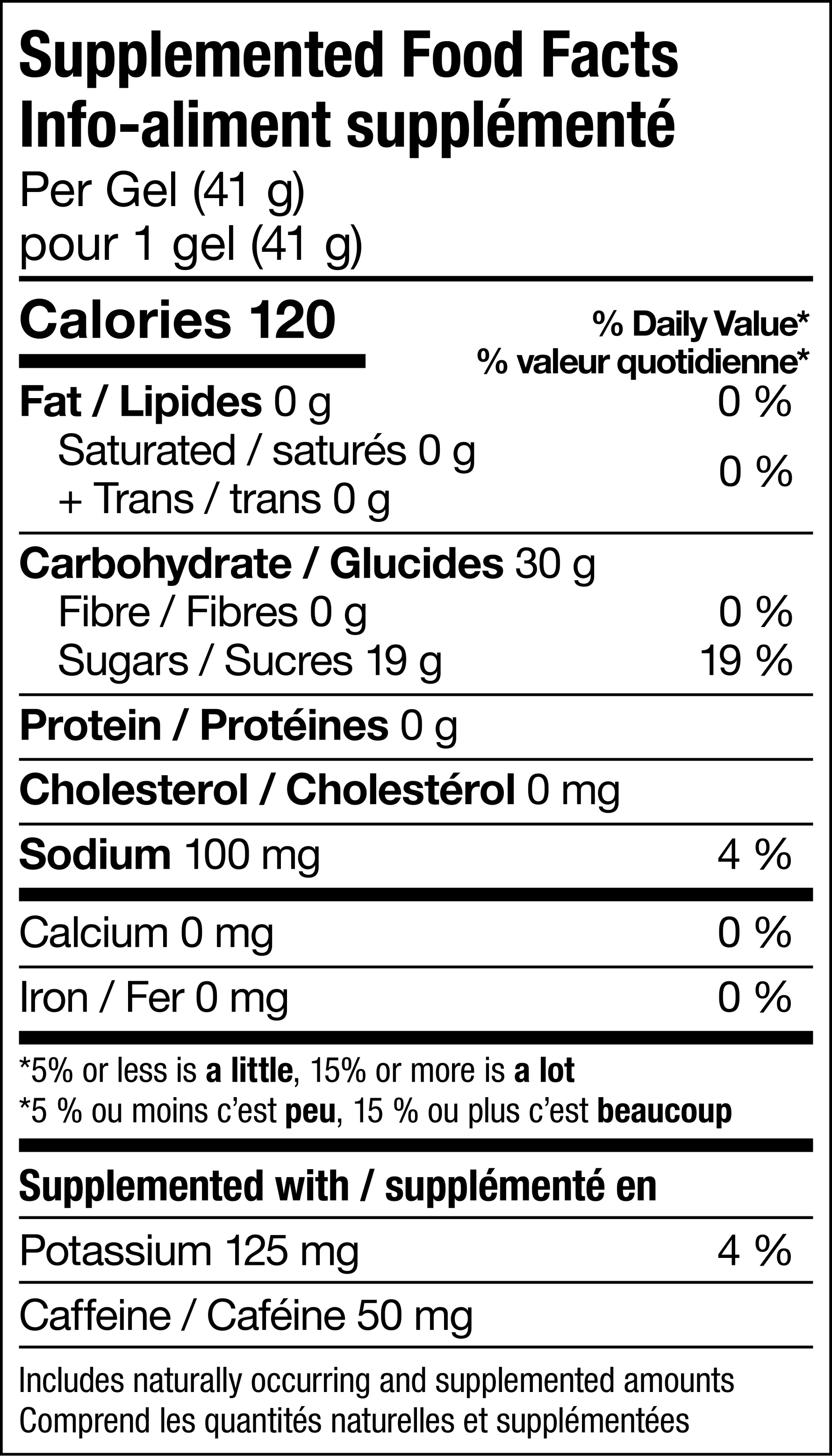 Gels à la caféine (Blackcurrant Performance) : 50 mg de caféine naturelle. L'effet maximal se fait sentir au bout de 30 à 120 minutes, donc consomme-le 60 minutes avant de vouloir en ressentir pleinement les effets.